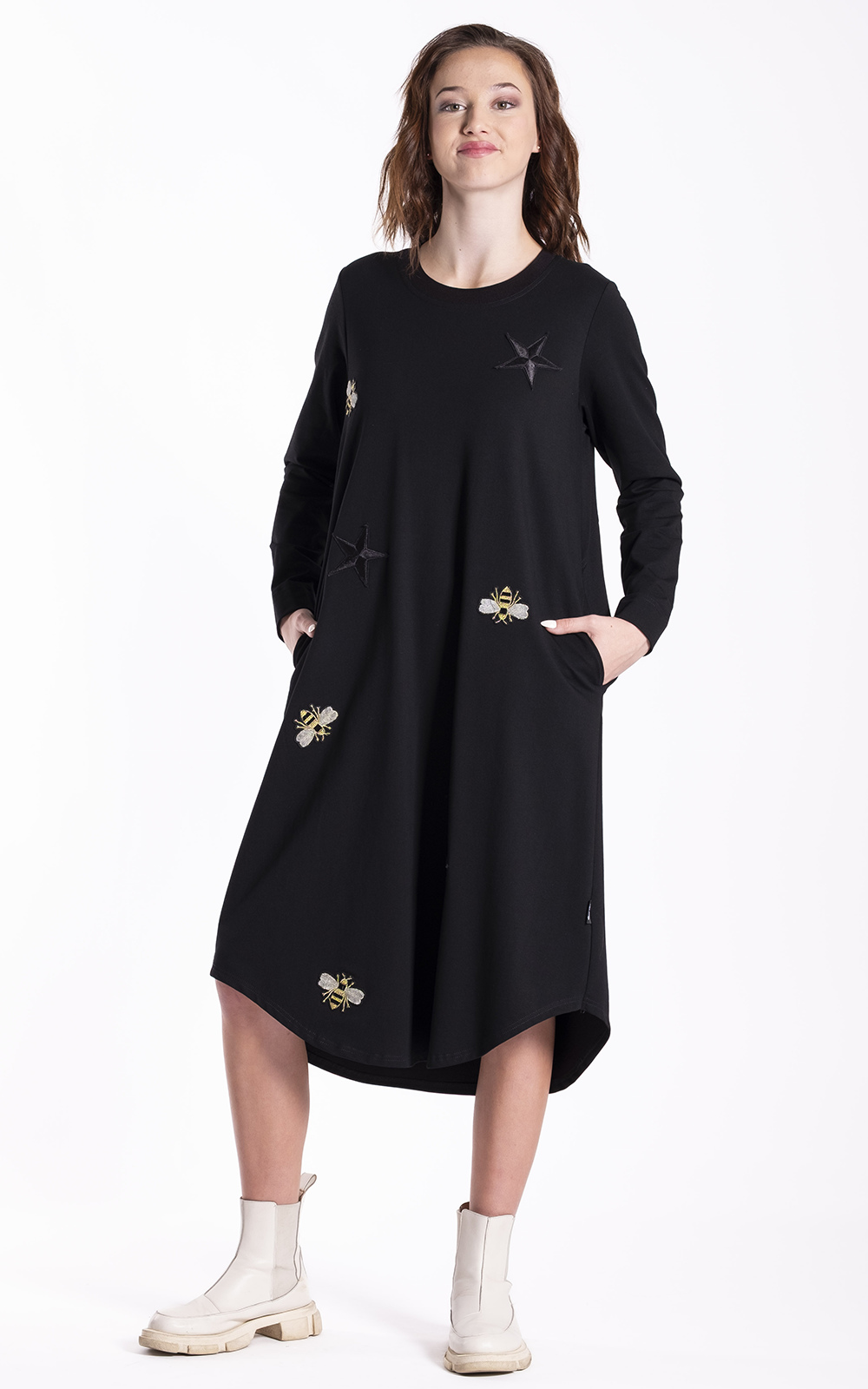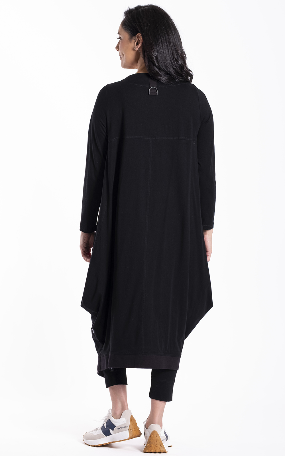 The Urban Fold Dress is a relaxed, contemporary women’s style designed with a softly sculpted silhouette and distinctive fold detailing. Featuring a clean round neckline, long sleeves with a simple cuff finish, and angled panel construction through the skirt, it creates movement and shape while remaining comfortable and easy to wear. Inseam side pockets and a midi-length design add practicality, while the Black colourway gives the dress a bold, modern feel. Designed in New Zealand for real women, the Urban Fold Dress offers an effortless silhouette that balances comfort with striking visual interest.
